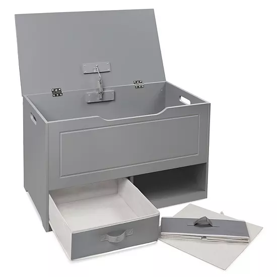 - Large compartment for toys and small baskets included for building bricks and action figures