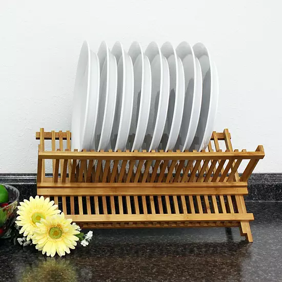 The classic look of this bamboo plate rack from BergHOFF will be a great addition to any kitchen décor with its functionallity. It is easy to wipe clean as needed and folds to store neatly in your cabinet.