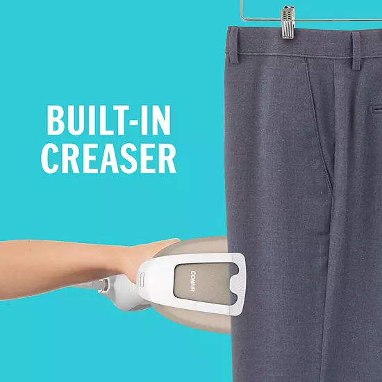 - Quilted aluminum steamer plate and built-in creaser perform like an iron for a fresh-pressed look