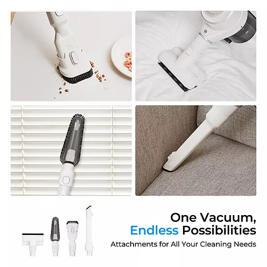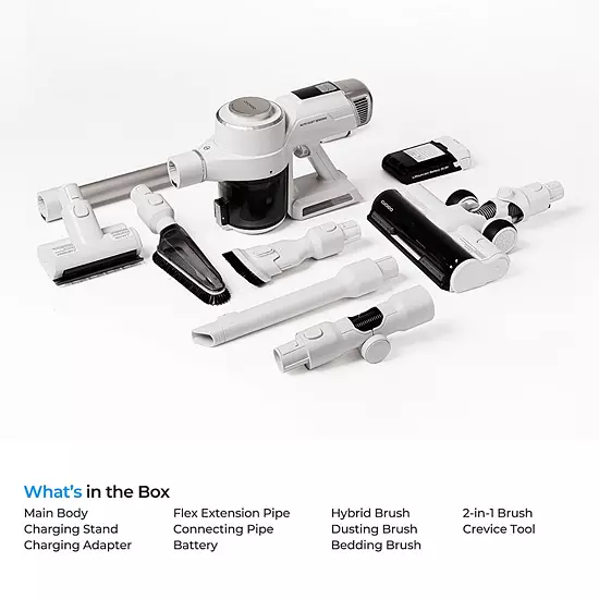 - Vacuum, pholstery brush, bedding brush, crevice tool, 2-in-1 brush, dusting brush, flex extension pipe, accessory holder, and product manual