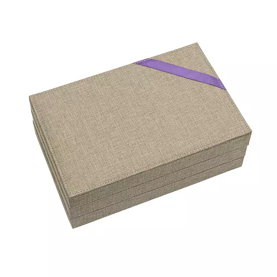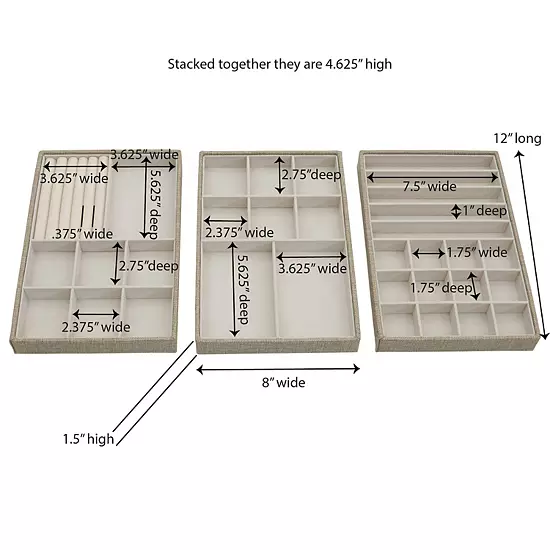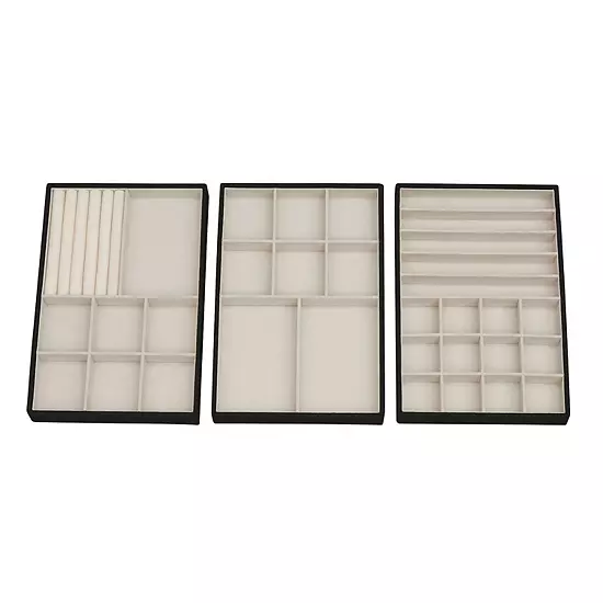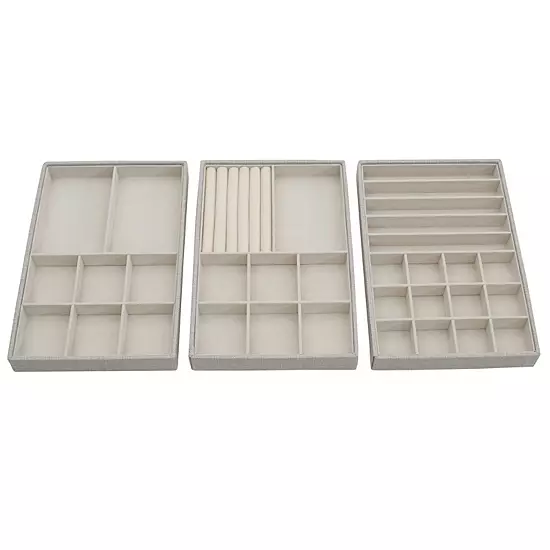- Houses all types of jewelry in one compact place. Very stylish and fits with every decor. Tray 1 has 12 small cups for earrings and 5 tall slots for necklaces. Tray 2 has 6 medium cups and 2 large cups. Tray 3 provides 6 pillowed rows for rings, 6 medium cups and 1 large cup. The interior fabric is gentle on jewelry and prevents snagging and scratches. Trays can be laid out separately inside a drawer or on top of a vanity. Trays can also be stacked to save space. Detachable lid for top tray when stacking. An elegant place to store valuables and costume jewelry
