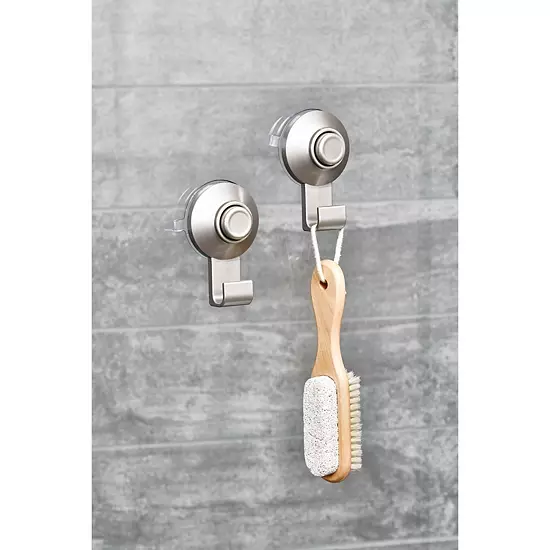 Upgrade your home’s storage solutions with the iDesign 2-Piece Satin Push-Lock Suction Shower Hooks Set.