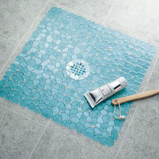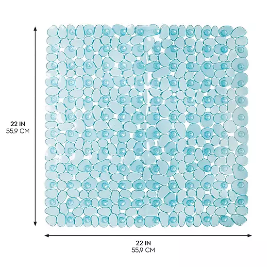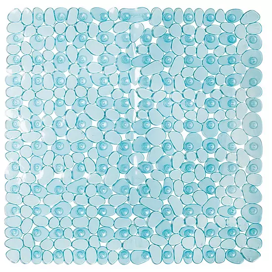 The iDesign Pebblz Non-Slip Suction Bath Mat in square blue design offers a spa-like aesthetic while preventing slips in the shower or bathtub. Its textured pebble surface and strong suction cups ensure comfort and stability.