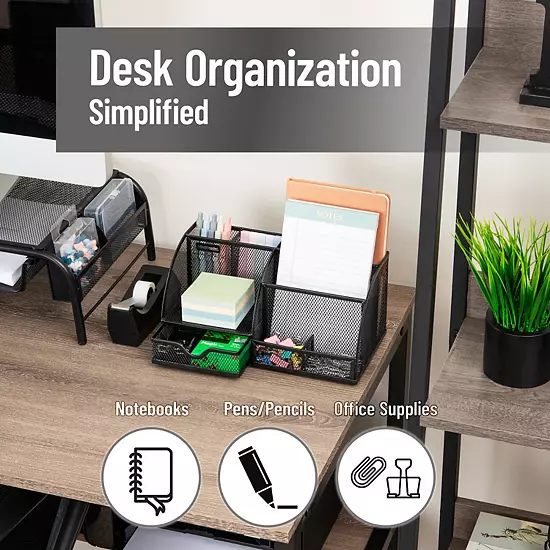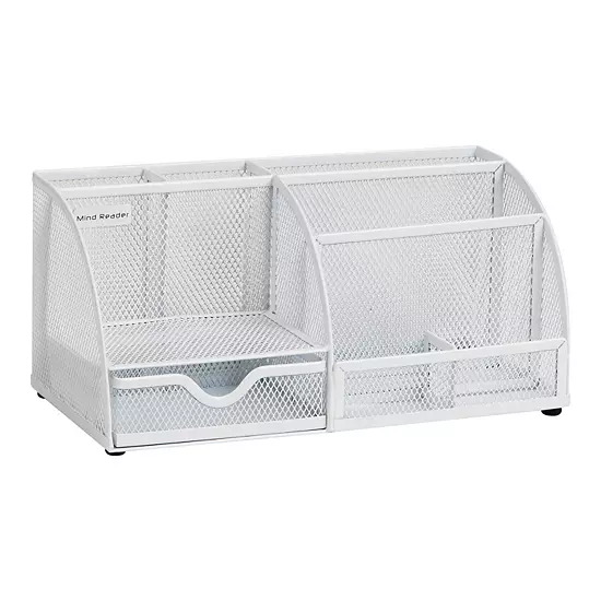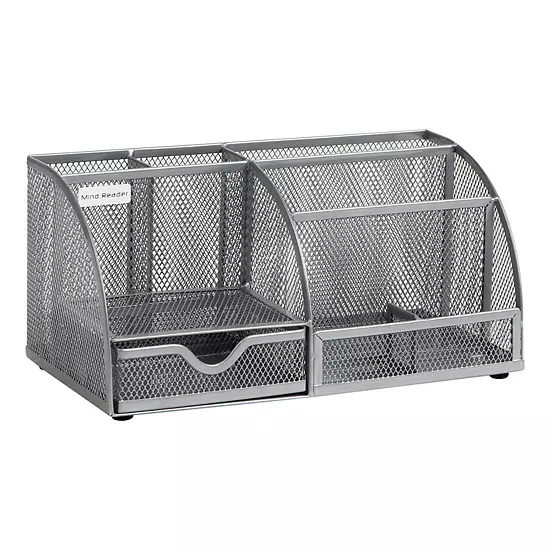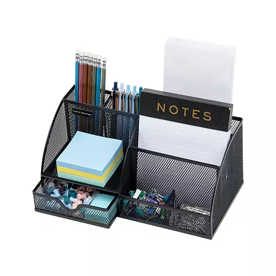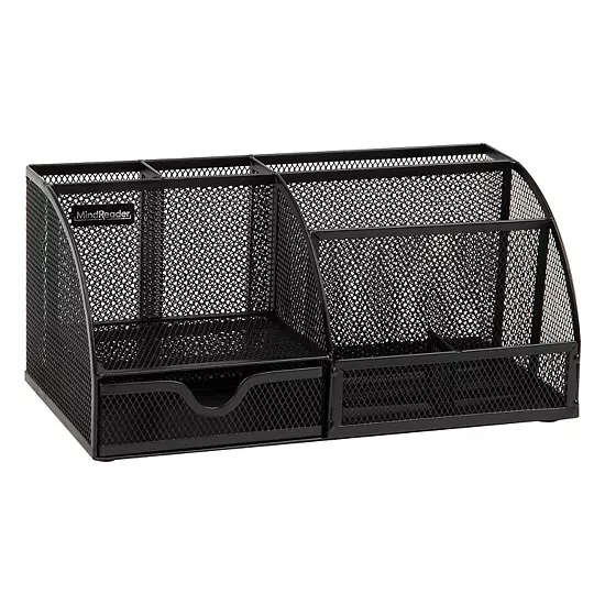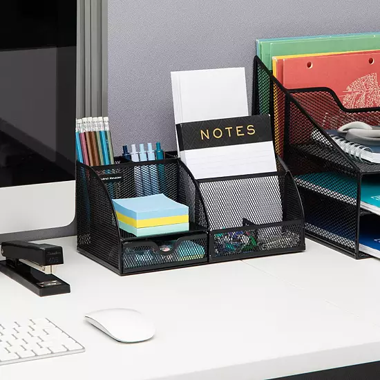- Keep your office desk organized and presentable. This desk organizer is equipped with 7 compartments that can be used as a pencil holder, pen cup, mail sorter, paperclip holder, sticky note holder or even an inbox tray for your desk. Made with a black mesh construction, this product is hard to bend or break. This office desk organizer will house your stationary cubicle accessories for years to come.