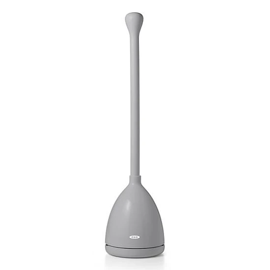- The OXO Good Grips Toilet Plunger and Canister is designed to open when you lift the Plunger and close when you replace it for neat and hassle-free plunging. The flat-top handle provides a secure, comfortable grip while you work. The Plunger head works on all toilets, including low-flush models. The ventilated drip tray contains any excess water and allows it to evaporate. The tidy Canister keeps the Plunger out of sight when not in use.