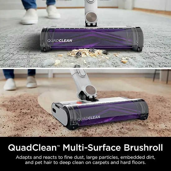 - The QuadClean multi-surface brushroll adapts and reacts to fine dust, large particles, embedded dirt, and pet hair to deep-clean carpets and hard floors. It’s even self-cleaning, so you’ll never deal with hair wrap.