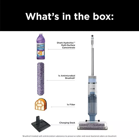 The Shark HydroVac Cordless Pro XL vacuums, mops and cleans itself with powerful suction and hydro mopping at the same time. It deep cleans hard floors and cleans area rugs with antimicrobial brushroll* and odor neutralizer technology. Includes- extra large water tank, headlights and LED display. *Brushroll treated with antimicrobial substance to preserve roller and resist bacterial odors on the brushroll.