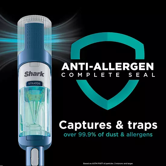 Stratos™ features Shark’s most advanced cleaning technology. The DuoClean® PowerFins™ Hair Pro™ nozzle grips and captures more dirt, debris and hair, and Odor Neutralizer Technology guards against bad odors inside your vacuum. Anti-Allergen Complete Seal with HEPA filtration traps fine particles as you clean.