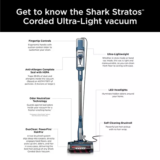 - Stratos™ features Shark’s most advanced cleaning technology. The DuoClean® PowerFins™ Hair Pro™ nozzle grips and captures more dirt, debris and hair, and Odor Neutralizer Technology guards against bad odors inside your vacuum. Anti-Allergen Complete Seal with HEPA filtration traps fine particles as you clean.