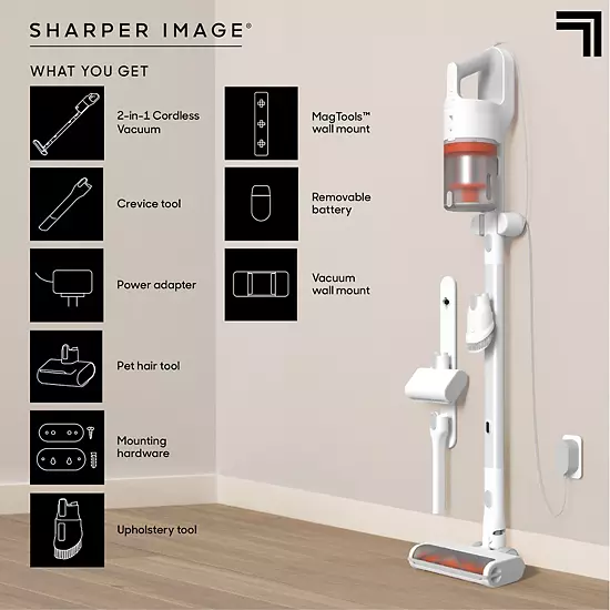 - 2-in-1 Cordless Vacuum, Crevice Tool, Upholstery Tool, MagTools™ Wall Mount, Pet hair Tool, Vacuum wall Mount, Mounting Hardware, Power Adapter, Removable Battery