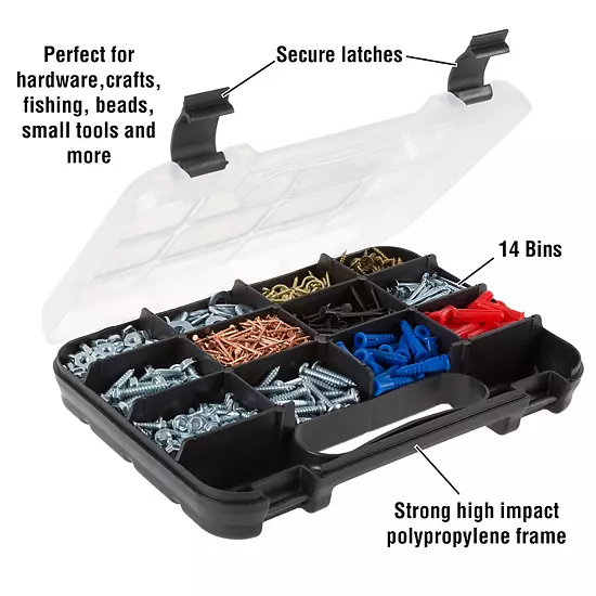 - 14 compartments, providing an organized way to store nails, bolts, screws, and other hardware. In addition, this case easily organizes crafts, beads, office supplies, fishing tackle and more!