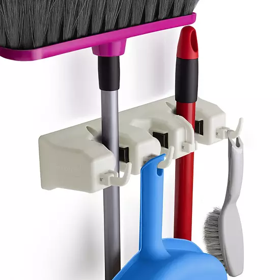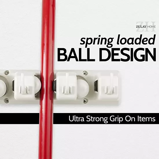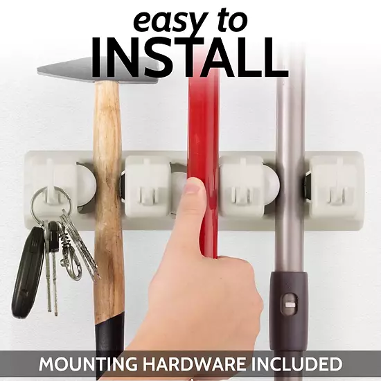 The set includes 1 mop and broom holder, 6 screws, 6 pipes, and a cardboard pattern, which would help you declutter and organize any messy space. Designed with 5 spring loaded clamp slots and 6 collapsible hooks that can carry and hold as much as 50 pounds of cleaning supplies. Perfect for hanging gloves, bottles, towels, helmets, and many more. Constructed with spring-loaded function with dual-sided non-slip slots to make items accessible when putting in or taking out, plus preventing objects from falling off when stored.